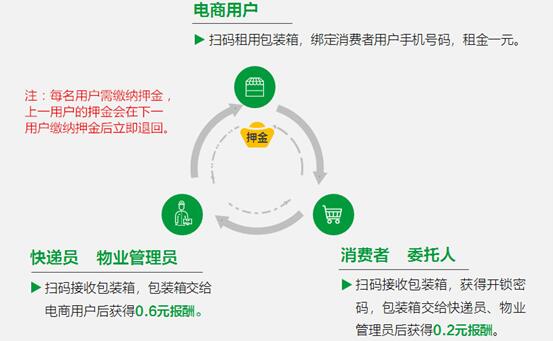 快递员将绿鸟包装箱交给需要使用的电商,电商再扫描二维码,缴纳押金。电商缴纳押金后,快递员的押金立即自动退回,同时快递员获得0.6元的报酬。就这样,包装箱的使用完成一个轮回,再次被自然而然地利用起来。