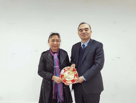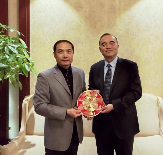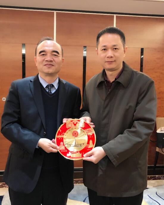 图4黑龙江省侨联主席郭占力与佛山侨联副主席费红玉交换纪念品留念