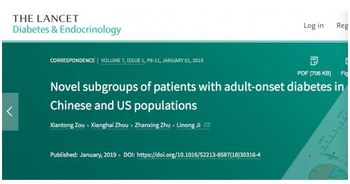 日前,国际权威杂志《柳叶刀》糖尿病与内分泌子刊(SCI影响因子19.13)2019年第7卷,第1期以研究短文的形式发表了北大人民医院纪立农团队的研究成果‘Novel subgroups of patients with adult-onset diabetes in Chinese and US populations’。该研究利用人工智能的方法对中国及美国的新诊断糖尿病人进行了重新的分类,为糖尿病的精准治疗奠定了理论基础。