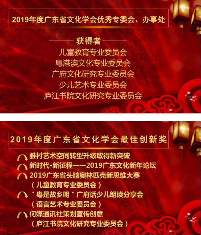 【何媒通讯社】(广州讯)2020年元月12日,中国广州图书馆1号报告厅,隆重举办着“红色传承 砥砺前行——2020年广东省文化学会迎新年会”,广东省一众文化大咖应邀出席,广东省文化学会全球会员,各专委会及社会各界代表参加了盛会,齐齐回顾了广东省文化学会2019沉甸甸的丰收果实,获奖机构及个人轮番登场接受学会的颁奖,俨然广东省文化界一个小型“奥斯卡”。