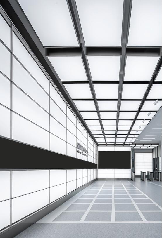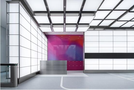 抽象的光变成具像的形态,这份光亮变得触手可及。设计用软膜灯箱来消除人工光源的刺眼感受,整体光源全部是柔和的发光面。大片的面光源用空间构成的手法形成整个大堂的光墙和顶面。大堂的主要功能是用于观众的汇聚和疏导。步入大堂首先看到的是由墙顶地构成的光网格空间,是观者用于合影留念的场地。右侧播放宣传片的屏幕嵌于光墙之中。两侧的安检闸机对应不同的参观流线。接待台背后的存包空间呈现了整个场所唯一的亮色,明艳的紫红色增加了空间的层次。材料和技法只是这次空间叙事的词汇,形式是呈现的结果,而这些都不是事件的出发点。