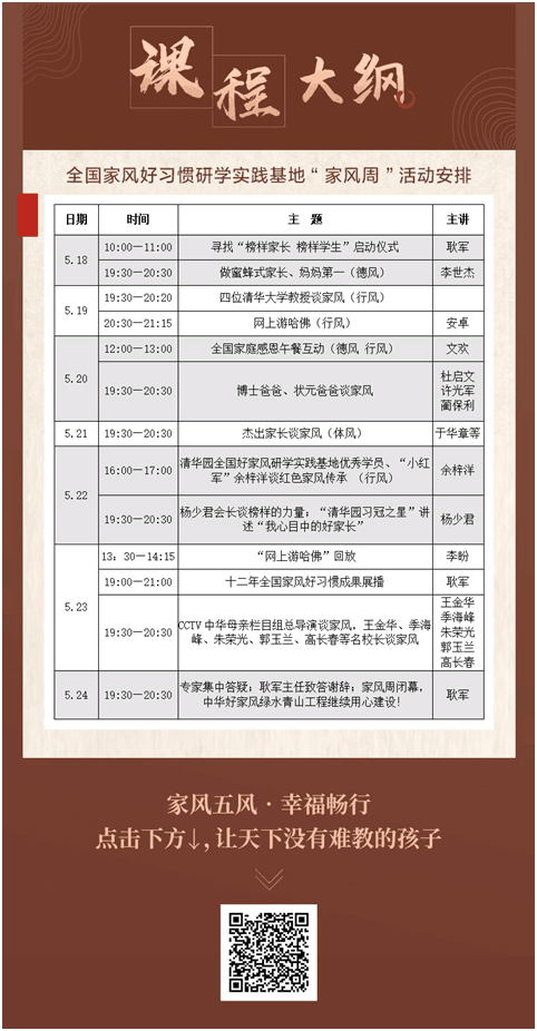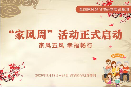 2020年5月18日—24日,位于清华大学所在的清华园的全国家风好习惯研学实践基地,联合中国管理科学研究院基础教育研究所、中国东方文化研究会榜样文化工作委员会、CCTV中华母亲栏目组、北京师大智慧教育科技研究院等单位,共同启动“家风周”活动。本次“家风周”的主题是:家风五风•幸福畅行。