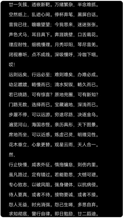 行止快慢,咸表外征。惰拖慵怠,则伤内里。虽凡路过,定错过。若能勤思,大憾可避。专心致志,以破风阻。强身健体,以搞病侵。待人要真,或者不待。接物要诚,或者不接。怨人无益,时光消弭。怨己生,多思自弃。求知彻底,警行自律。即日勉厣,廿二蹈迪。