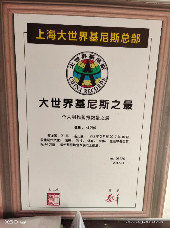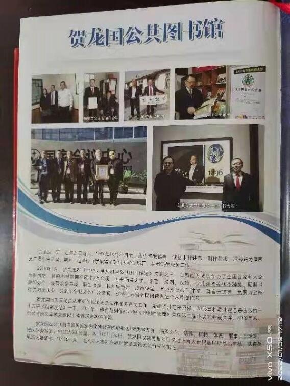 年鉴中记载:54岁的贺龙国从小就喜爱读书,读初中时迷上制作剪报。高中毕业走上社会后,参加中华律师函授并通过学,获得苏州大学法学院学历。其次,2O14年,被评为江苏省全民阅读先进个人。另外,投入百万元,成功创办全国首家私人公共图书馆,免费向社会开放。他无论是从事新闻报道员还是从事法律服务工作,都坚持笔耕不辍,剪报一直不停,而且到了一发不可收拾的状态。勤于写作也成就他获得丰硕成果,2008年,和吴沭霆编著的30万字《百案说法》一书出版发行,社会反映强烈;2011年,他参与创作的小说《带刺的玫瑰》荣获第二届全国小说笔会评选最高奖;30多年来,他采写的消息、通讯以及评论类稿件在县以上新闻媒体发表1100多篇。年鉴中的记载,展现了贺龙国多年来“奋斗”惟存不懈奋斗,才能梦想成真的道理。