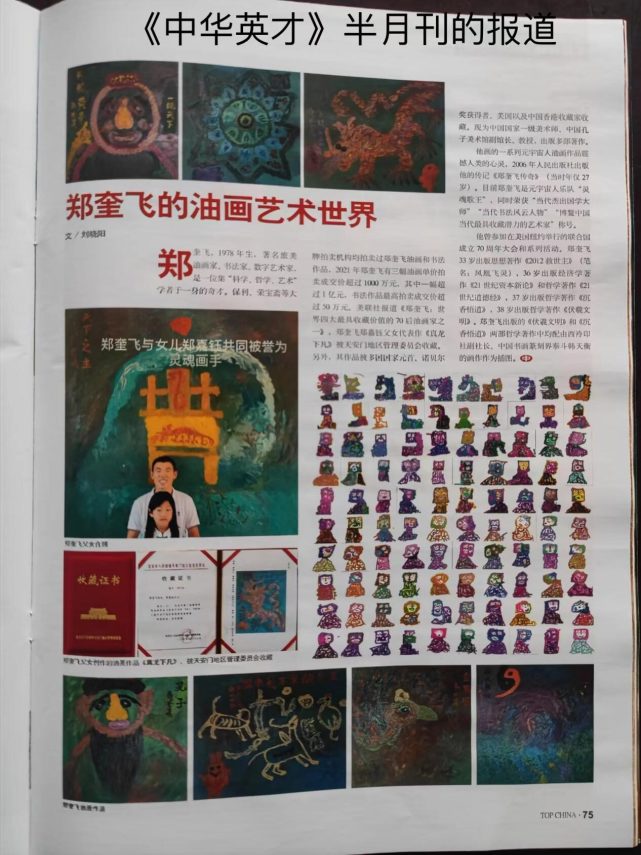 郑奎飞:1978年生,著名油画家、书法家、数字艺术家,是一位集“科学、哲学、艺术”于一身的奇才。现为国家一级美术师、中国孔子美术馆副馆长、教授,山东济南电视台书画特约导师。已出版多部著作:2006年人民出版社出版他的首部传记《郑奎飞传奇》,33岁出版思想著作《2012救世主》,36岁出版经济学著作《21世纪资本新论》(因此书中的新理论他与现任北京大学常务副校长刘伟当年共同荣获第三届十大中华经济英才奖)和哲学著作《21世纪道德经》,37岁出版哲学著作《沉香悟道》,38岁出版哲学著作《伏羲文明》(此书由西泠印社副社长韩天衡画作作为配图)。43岁出版画册《元宇宙》(与女儿郑嘉钰共同绘著),保利、荣宝斋等拍卖机构均拍卖过郑奎飞郑嘉钰父女共同创作的多幅油画和书法作品。中国艺术研究院主管主办的《中华英才》半月刊整版刊登郑奎飞父女油画。
