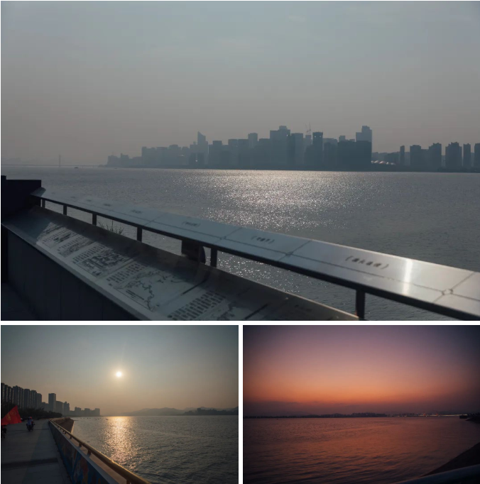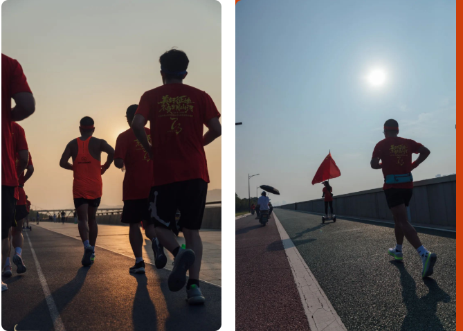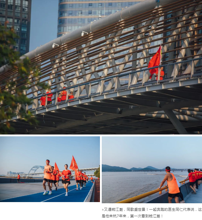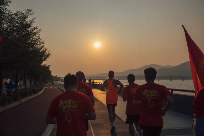 钱塘江水与跑团共同奔赴,太阳在下山前不忘送上称赞和鼓励。