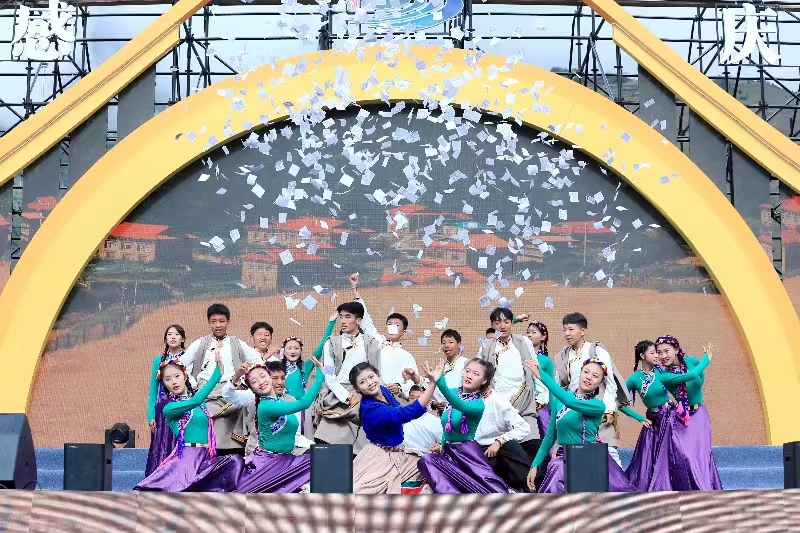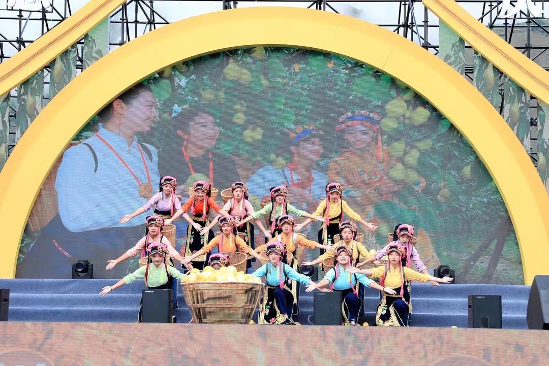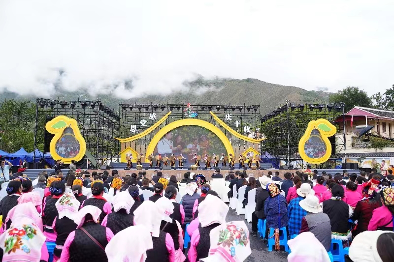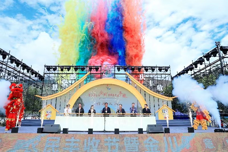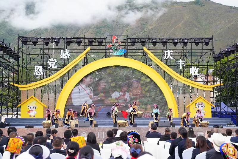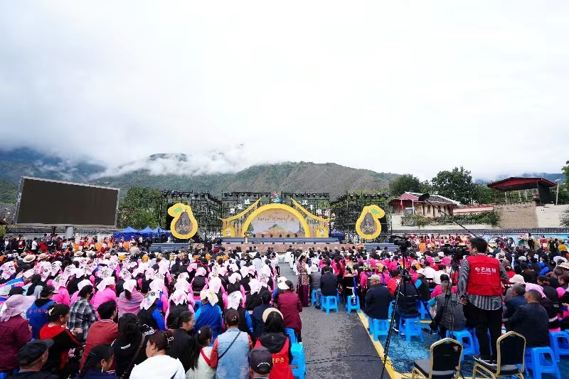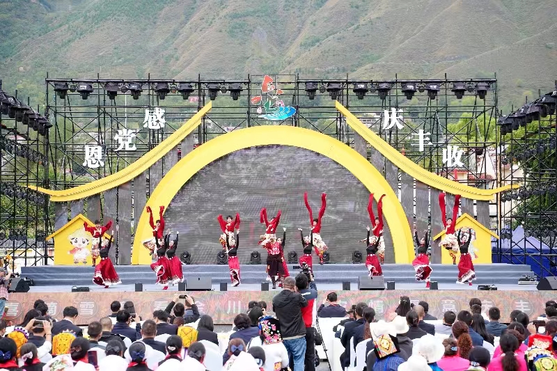 开幕式在开场舞表演《锦绣梨园》中圆满拉开帷幕,随后,全体人员起立,奏唱国歌。来自金川县的各族群众自编自演极具代表的歌舞表演《梨树下的嘉绒姑娘》、《金川儿女心向党》、歌曲《金色山川》轮番上演,为现场观众带来了精彩的视听盛宴。演职人员身着民族服饰,踏着欢快的旋律,洋溢着热情的微笑,手持背篓、扁担等形形色色的农用器具,将现场观众带入丰收的喜悦氛围中。