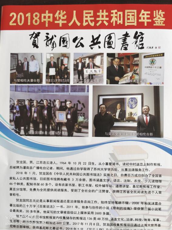 2019年阳春三月,正是全国“两会”召开之际,贺龙国公共图书馆馆长贺龙国得到首都北京传来的喜讯,2018年《中华人民共和国年鉴》出版发行,由其投资创办的贺龙国公共图书馆、莫言分馆、基尼斯剪报之最工作室、职工书屋、校外捕导站列编其中。