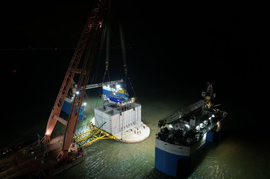 下午1点,距离大风到来还有16个小时。此时,项目团队还需要解决最后一个难题,那就是如何在短时间内将“大圆桶”沉放到位。项目团队经过反复核对海面潮汐、水域流速等数据,判断出下午4点到次日清晨5点的风浪较小,适合安装作业。黄存东与项目技术团队果断调整方案,将沉放施工流程与桶体姿态数据监测同步进行,并且在施工船舶、监测点位等关键岗位安排双倍人员进行值守,以此加快“大圆桶”沉放进度。