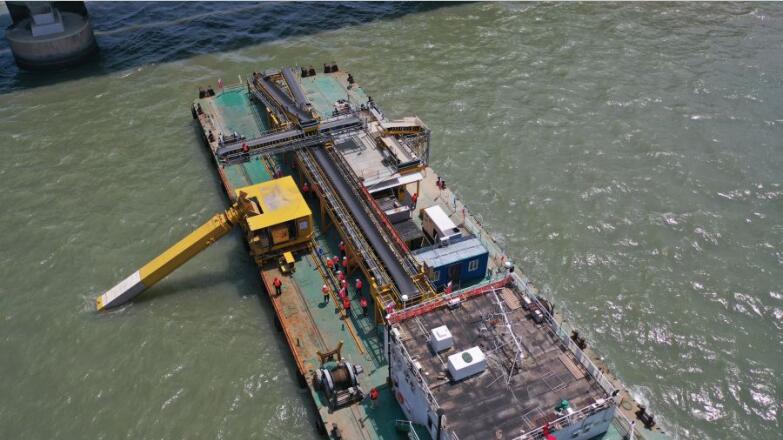 2022年1月,我国国内唯一适用于桩群内冲刷坑回填材料抛填的专用设备,三航局自行研制的集砂石水泥料存放、混凝土搅拌、袋装混凝土打包、运输、抛填为一体的新型抛石溜筒搅拌船——“三航砼26(28)”顺利下水。正式启用下,目前单船单日抛填量最大可达1400方,项目降本增效成果显著。