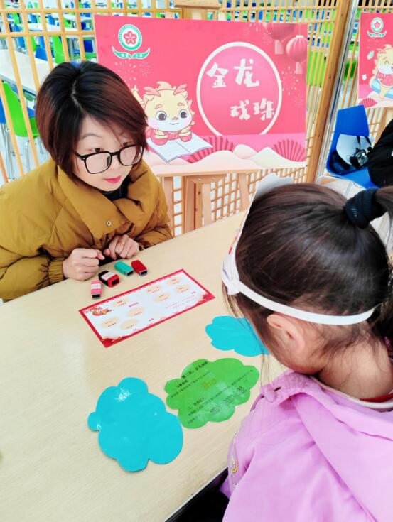 学校低年级组老师精心设计有趣的游园活动,将各门学科的知识以及生活技能融入闯关中,小朋友们兴趣盎然。“‘龙’重登场”“金龙识字”“活龙活现”“神龙妙语”,考查孩子们的语文素养。他们随机抽出题卡,根据题卡要求完成识字、背诵、看图说话等任务;数学关卡“慧龙巧算”“金龙戏珠”“龙卷风暴”,孩子们根据题卡点数、计算、拼搭、剪拼,行云流水的操作应答,赢得了每一位老师的称赞;综合学科关卡涵盖劳动、美术、音乐、体育四个学科,孩子们或静心作画,或灵活跳绳,或专心叠衣,或嘹亮歌唱,每一关都充满了童心和童趣,学生在轻松愉悦的氛围中尽情地展示自己。看着手中贴满小星星的通关卡,小朋友们意犹未尽,神采飞扬。