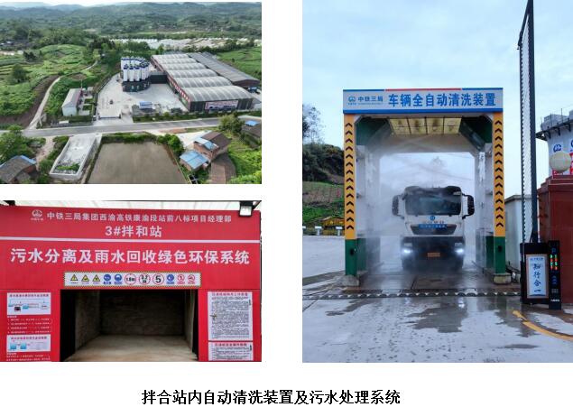 在松坪村2号拌合站内,几辆水泥罐车正在排队等待“焕然一新”,这是拌合站出入口设置的“自动清洗装置”。为实现临建工程绿色环保,康渝八标项目拌合站内,所有料仓及主机均采用全封闭结构,既保证施工不受天气影响,也确保了对周围环境的零污染。拌合站里还设置了大量微创新工艺,如料罐自动除尘设备以解决工人高空清洗的安全风险问题;拌合站温度监控系统以及自动除尘装置以便更好地保证混凝土质量,并在拌合站内增加污水处理设备,将污水集中在清水池中,通过三级沉淀池及压滤机处理后循环利用实现绿色环保,低碳高效。同时拌和站场地全部采用C20混凝土硬化,场地平整按照“四周低、中心高”的原则进行,面层排水坡度不应小于2%,场地四周设置排水沟,防止污水外流。
