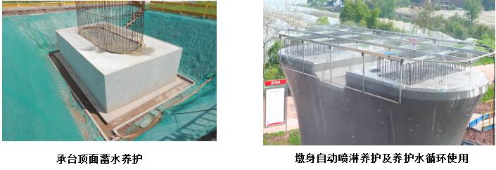 “绿色环保”也同样体现自康渝八标的施工现场:承台顶面进行蓄水养护,在拆除承台模板后,采用5cm厚胶条粘于承台顶面,然后注水进行蓄水养护,保证混凝土表面经常处于湿润状态,现场每天仅需加水两次,养护用水可节约60%以上。