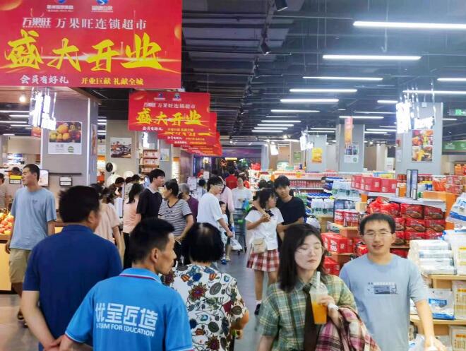 近日,位于武汉市江夏区光谷青年汇的万果旺连锁超市正在试营业,活动现场人头攒动、客流如织、异常火爆。超市针对武汉人群特色,商品也特别突出差异化,不仅吸引了大学生群体驻足,还吸引了众多周边居民挑选购买。超市货架上的商品琳琅满目、排列整齐,凭借全新的面貌、贴心的服务和物廉价美的商品赢得了顾客们的一致好评和高度赞扬。