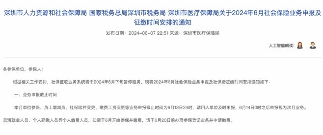 根据6月7日深圳市医疗保障局官网与“深圳惠民保”微信公众号发布内容,因社保征收业务系统将于2024年6月下旬暂停服务,有意向参保“深圳惠民保”的单位请于6月21日晚上18点前办理线上参保登记业务申报。