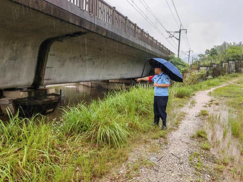 萍乡北站派出所全体干警将不惧危险,迎汛而战,坚守防汛抗洪第一线,用行动筑牢“铁路安全堤坝”。