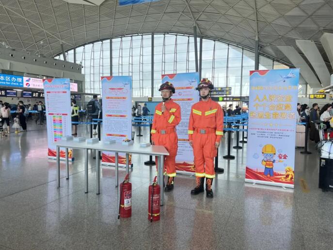 6月16日“安全宣传咨询日”当天,分公司在T3航站楼设置展台、现场组织旅客和员工观看安全宣传视频,邀请消防护卫讲解身边消防事故危害,展示消防设备使用方法。