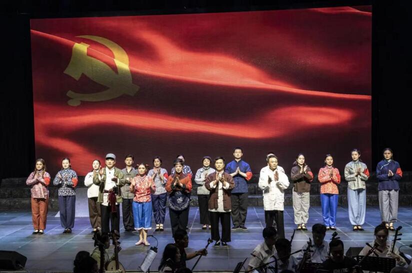 老党员殷红坚创作、支部组织排演的红色淮海戏《党旗》剧照。