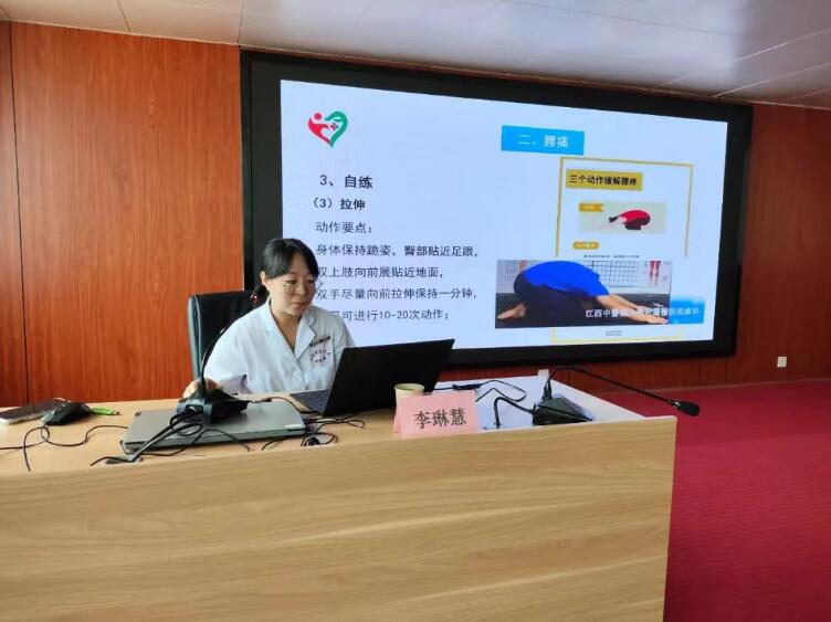 活动邀请了江西中医药大学附属医院、江西省中医院、江西省骨伤医院医学博士、副教授、硕士研究生导师李琳慧就颈肩疾病的中医预防与自我保健进行专题授课。她向大家介绍了热敏灸、力敏推拿、耳穴压豆三种肩颈病外治技术,讲授了颈椎病、腰痛、失眠等的自测、自疗、自练方法,通过图片对比让大家了解了颈椎病的成因和类型,强调要坚持预防调护,纠正不良姿势,做到早发现、早治疗。
