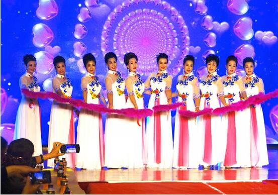 中国旗袍协会全球联盟新疆联合总会的旗袍佳丽们表演气势恢宏的《盛唐霓裳》